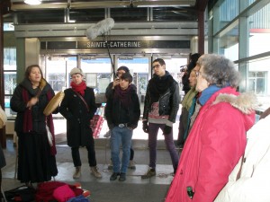 Cabot Square’s trees are now leafless and the cold is settling in. It is time to move indoors and so today we decided to try out the Atwater Metro station’s entry at Atwater and St. Catherine Street. When we arrived we discovered many of the park’s inhabitants keeping warm, including members of the Inuit community we have had the chance to meet since the summer when we started visiting Dare-Dare in its new location.