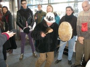 Emilie, today’s teacher, is of Anishnabe descent and a member of Odaya, a group of six first-nation women singers. At her invitation two other members came: Lisa, of Saulteaux descent and Moe, of Métis descent. Upon arriving, Lisa and Emilie talked with one of the leaders of the Inuit community who spoke at length of his life experiences. This was a bridge and opening to let those indoors know why we were there, what we hoped to do and an invitation for them to join us if they wished.